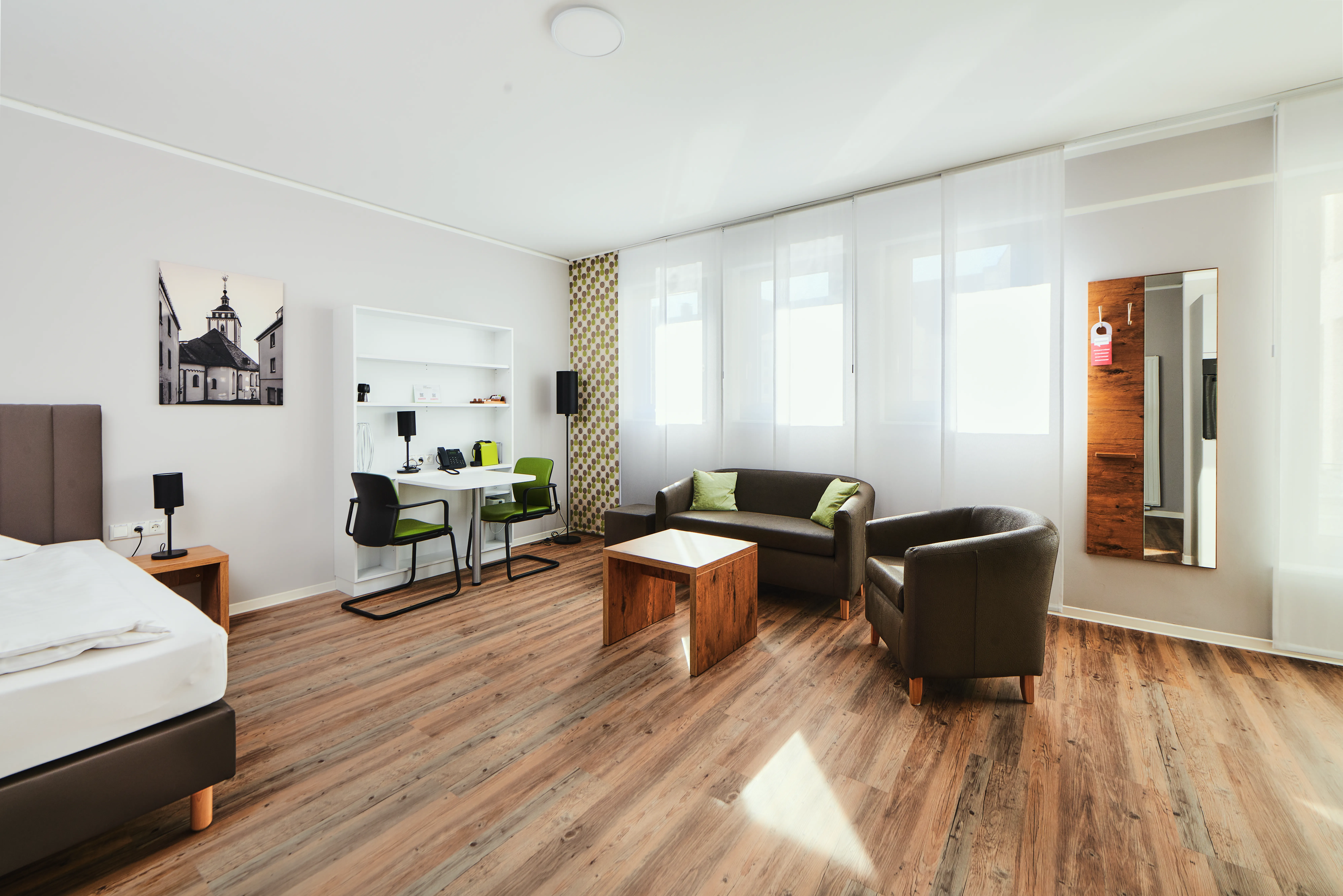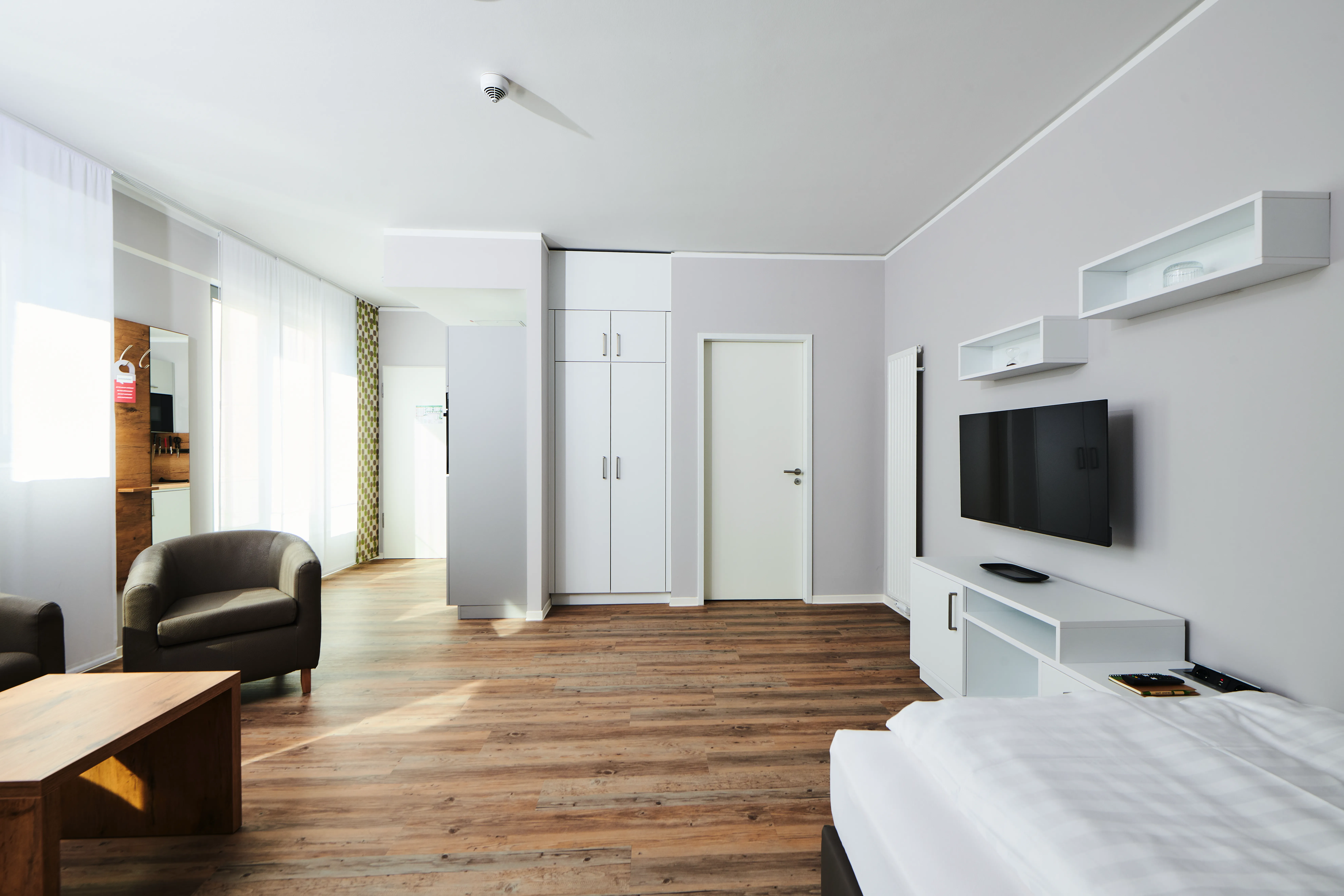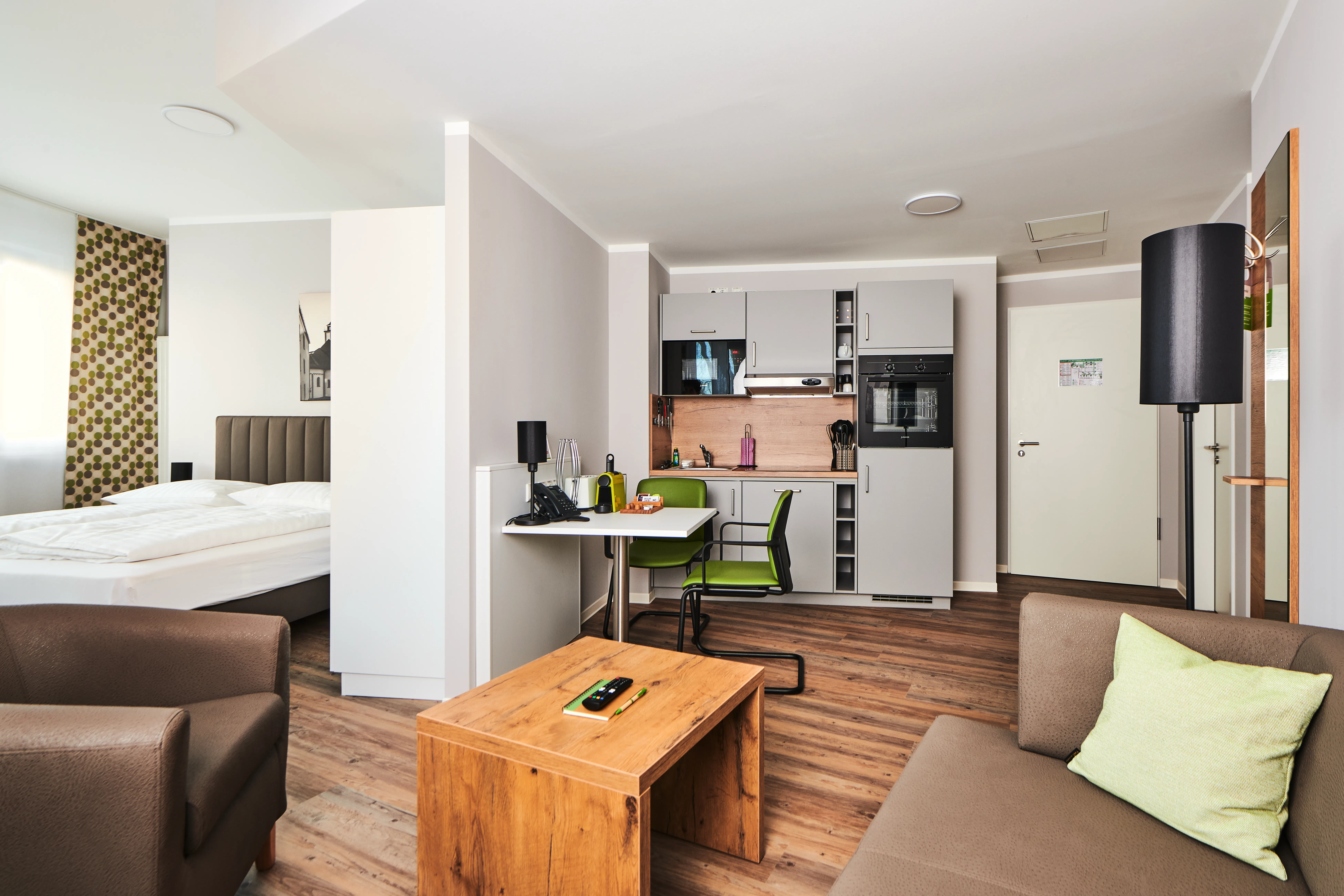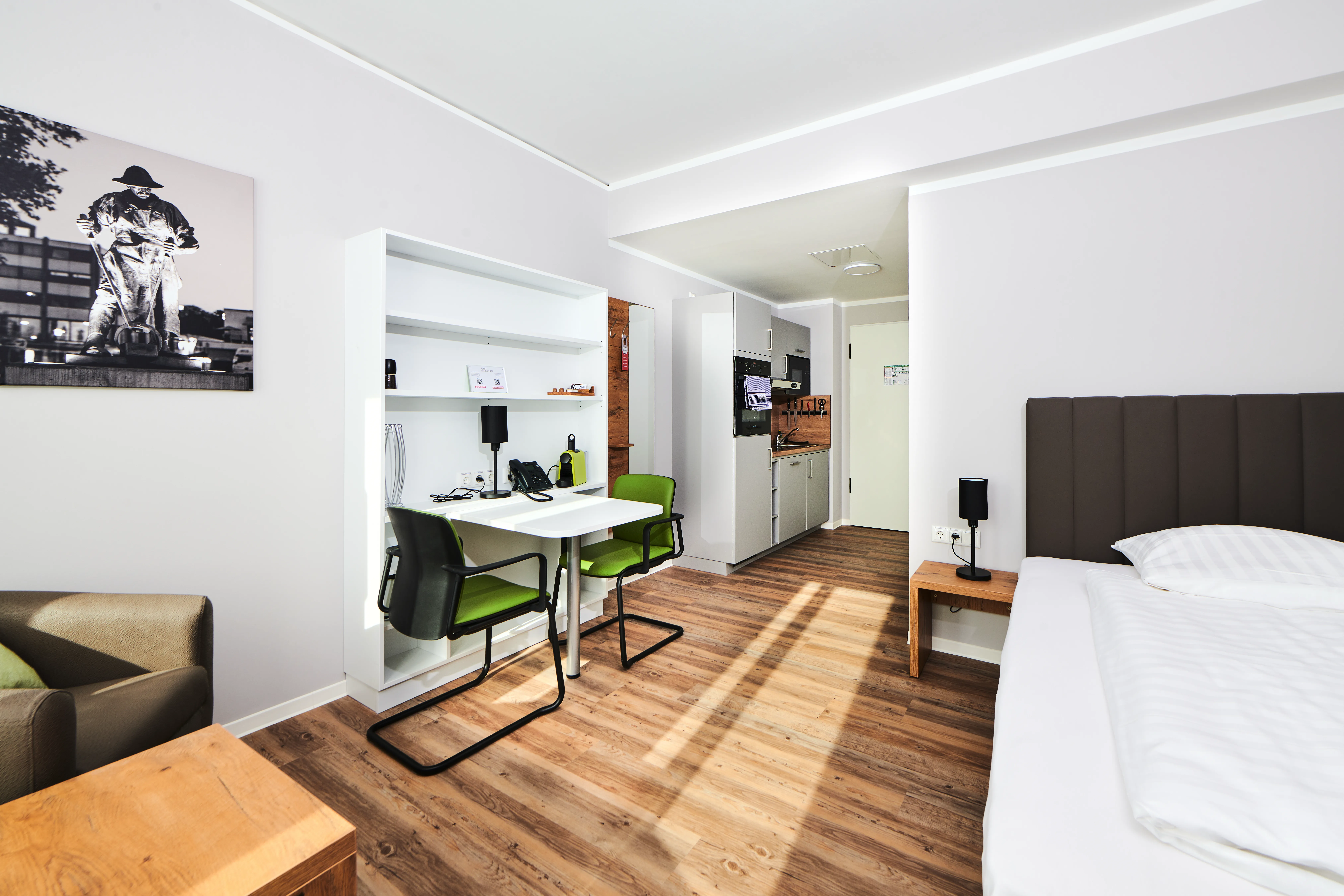 Unsere großen Doppelzimmer: Für alle, die es gerne großzügiger mögen. Maßgefertigte Designerküche, Boxspring-Bett, Arbeits- und Wohnbereich.