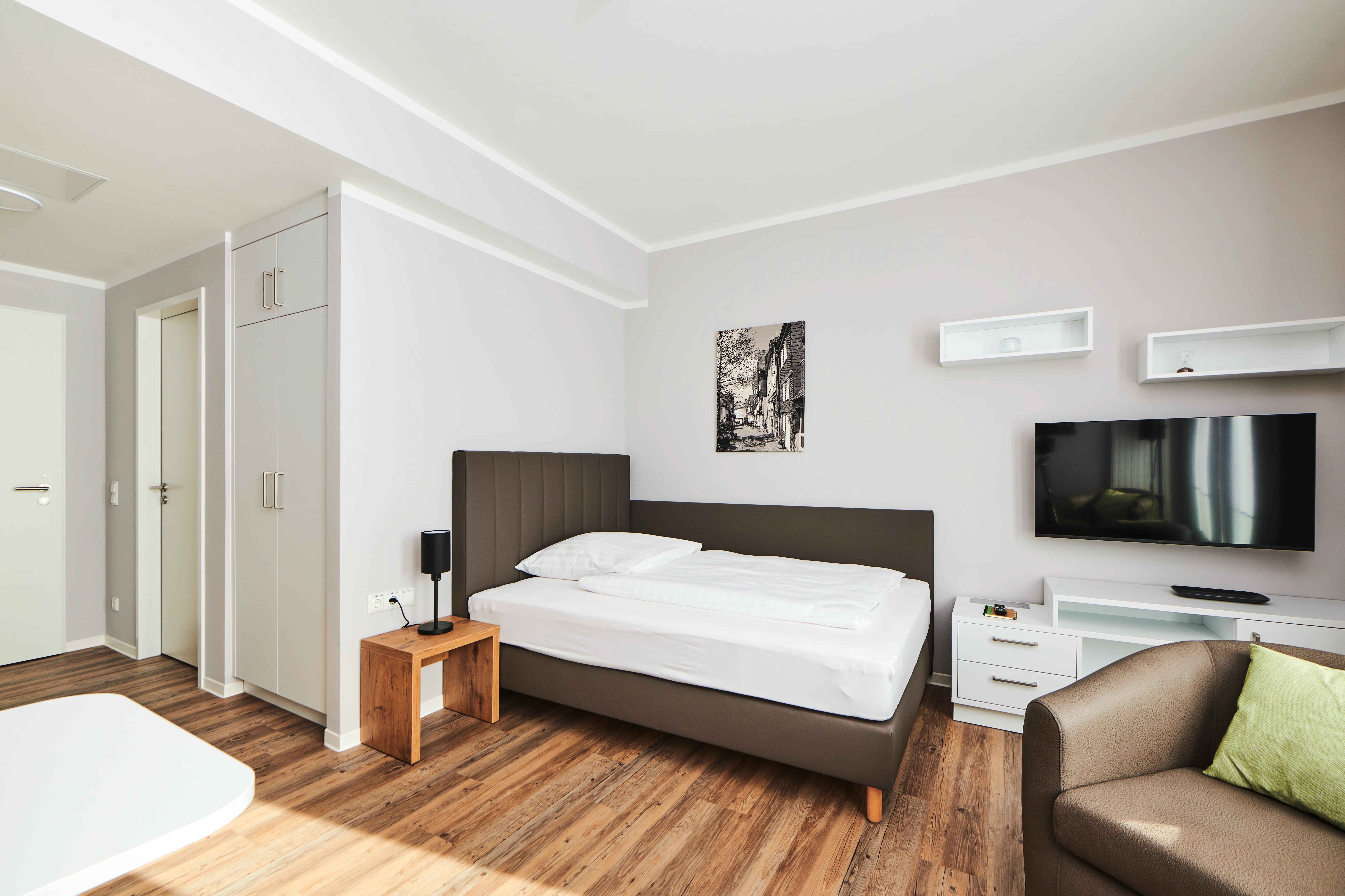 Unsere kleinen Doppelzimmer sind ideal für Ihren Aufenthalt zu zweit. Maßgefertigte Designerküche, Boxspring-Bett, Arbeits- und Wohnbereich.