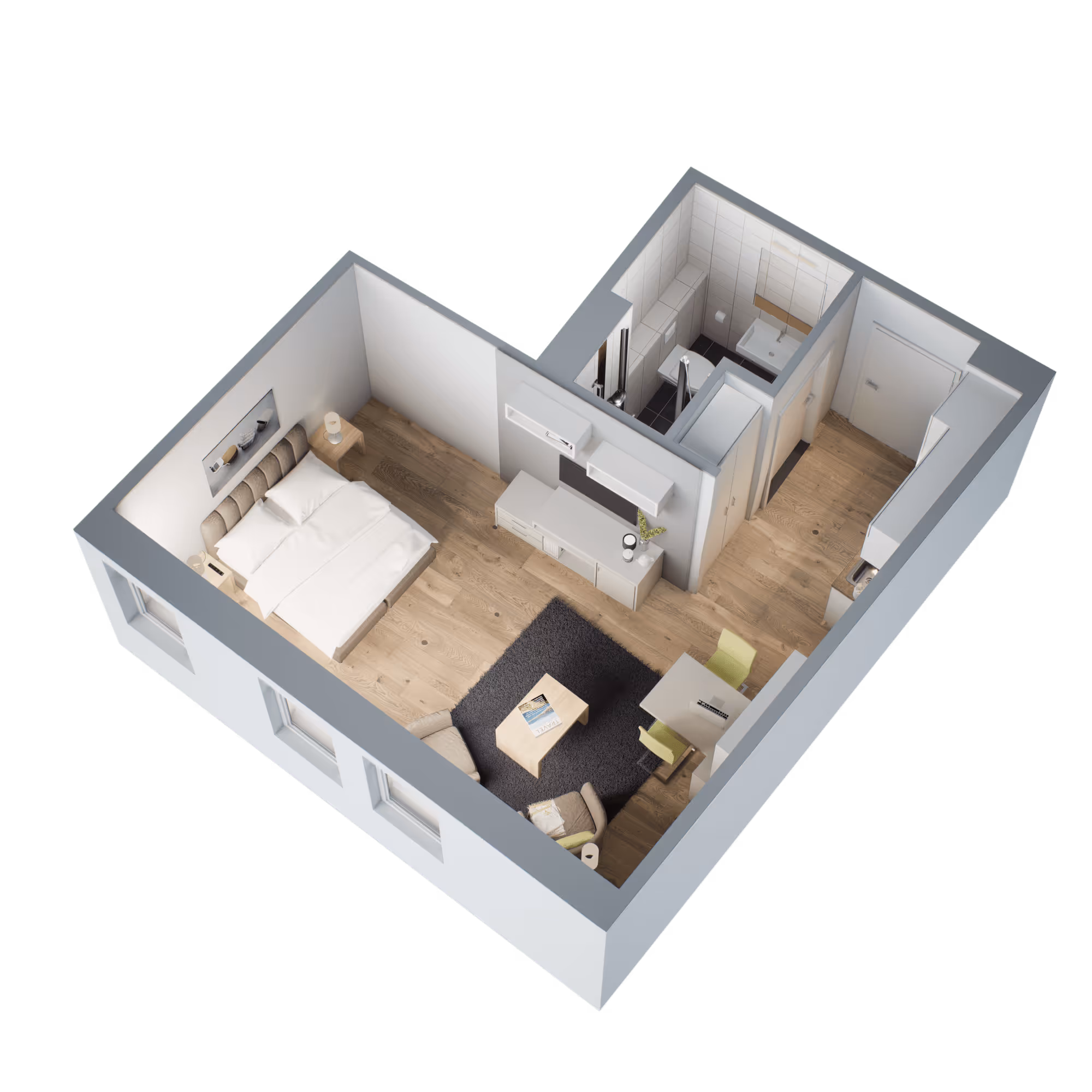 Unsere kleinen Einzelzimmer sind echte Raumwunder. Hier finden Sie alle wichtigen Funktionen für einen komfortablen Aufenthalt. Ideal für Alleinreisende, die Wert auf ein optimales Preis-Leistungs-Verhältnis legen. Maßgefertigte Designerküche, Boxspring-Bett, Arbeits- und Wohnbereich.